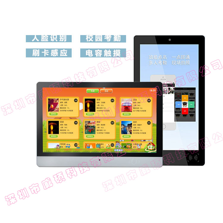 威碩科技智慧校園電子班牌系統包含:威碩科技電子班牌硬件平臺、智慧校園電子班牌軟件平臺以及微信客戶端平臺。電子班牌硬件平臺是帶有人臉識別、刷卡、觸控互動、網絡連接等功能,其尺寸為15.6寸、18.5寸、21.5寸,有橫式安裝有豎式安裝,可根據情況定制。軟件平臺主要用于構建學校基礎架構,進行成員分級分權限管理以及運營數據匯總,通過數據匯總定制不同的教學方案,各項智慧化的人性化的功能是智慧校園建設的前提條件。